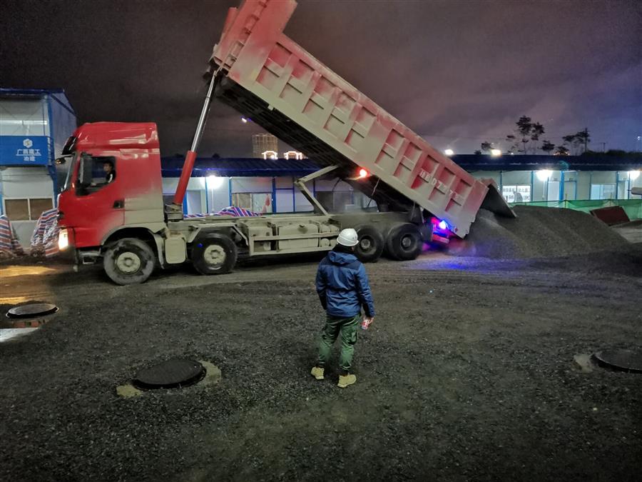 為全力沖刺四季度,項目部實行“快馬加鞭、保質(zhì)保量、人停機不停、晝夜料不停!”的搶工模式,在保證安全和質(zhì)量的前提下,項目部全體成員搶抓施工黃金期,全力以赴推進項目建設(shè)。為加快項目建設(shè),項目部反復討論研究制定了科學的施工計劃,合理安排人力物力。面對晚間要拉運回填土方和石料的問題,項目部采取人員輪流值班,料來人在,統(tǒng)一指揮的措施,做到合理配置堆放,減少二次運輸,提高工作效率。