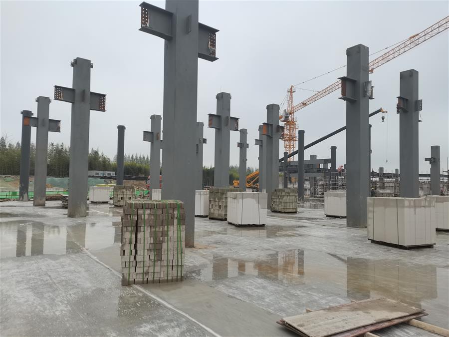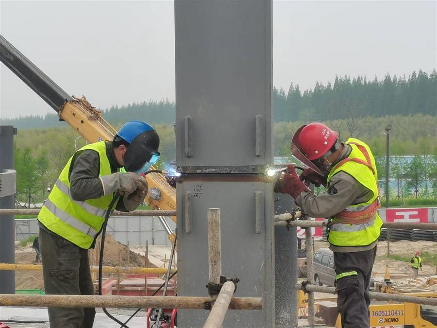 項目所在地受疫情影響較大,為統(tǒng)籌抓好項目疫情防控、安全生產(chǎn)、施工進度等工作,項目部嚴格落實疫情常態(tài)化防控措施,做好日常測體溫、消毒等工作,并對項目進行統(tǒng)籌規(guī)劃,根據(jù)“白+黑”“晴+雨”的天氣情況,合理安排相應的施工任務,同時加強吊裝機械設備的排班策劃力度,合理安排穿插作業(yè),確保工程進度如期完成。經(jīng)過兩個月的施工,目前項目正在進行第一層鋼梁安裝焊接和砌體結(jié)構(gòu)砌筑、二層鋼柱吊裝安裝等工序。