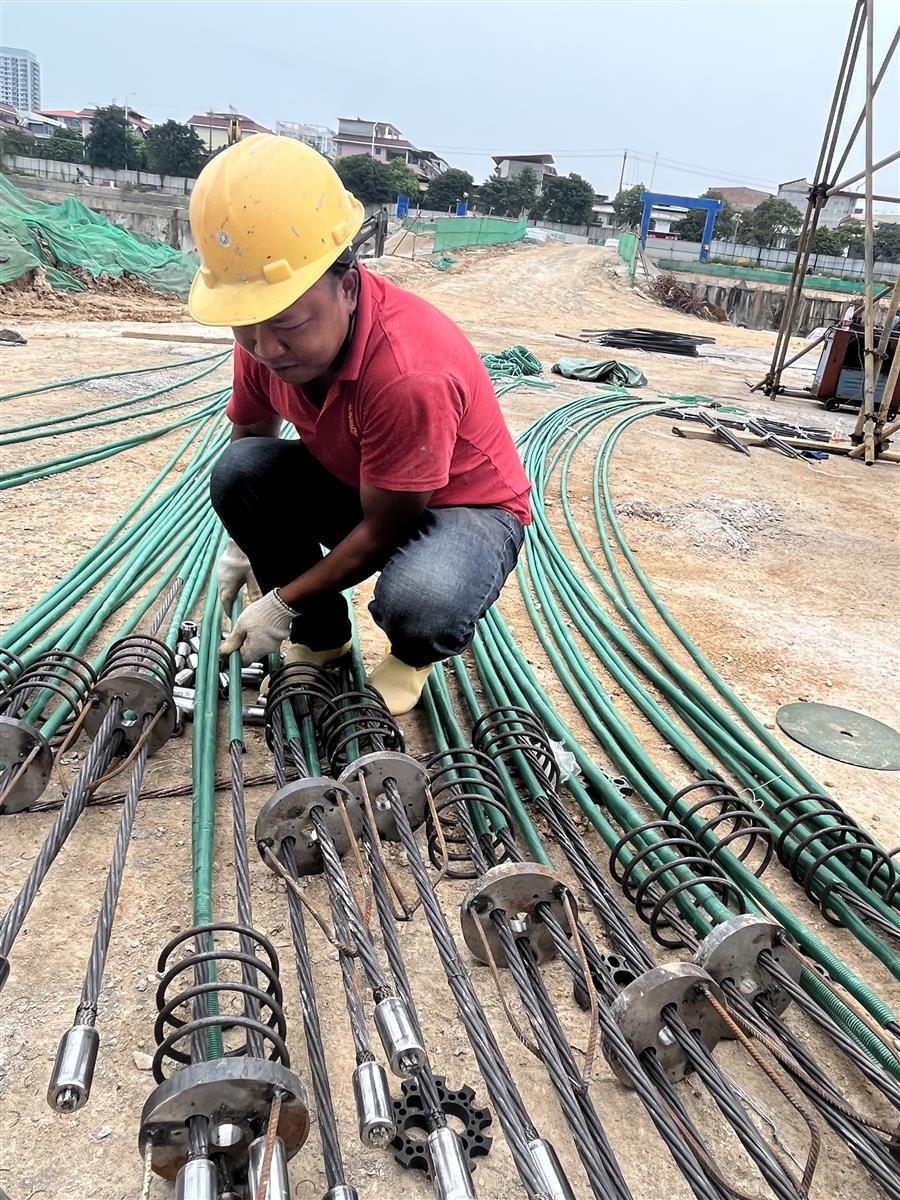 貴港市棚戶區(qū)改造(三期)白凹窩安置區(qū)項(xiàng)目B2標(biāo)段項(xiàng)目,工人正在進(jìn)行壓力型預(yù)應(yīng)力抗浮錨桿加工。