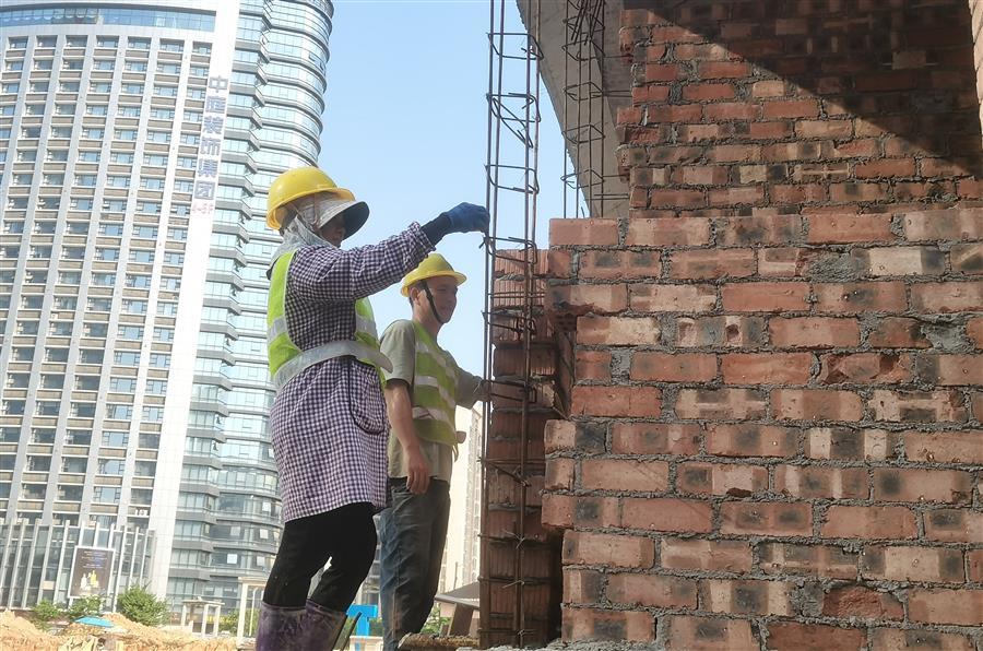 桂中大道東區(qū)地下停車場(chǎng)項(xiàng)目,工人在砌筑墻體。