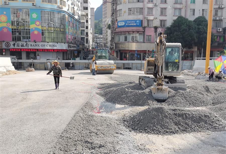 鹿寨縣城南新區(qū)城中村改造項(xiàng)目設(shè)計(jì)-采購-施工(EPC)總承包項(xiàng)目,工人正在對(duì)室外道路鋪設(shè)瀝青。