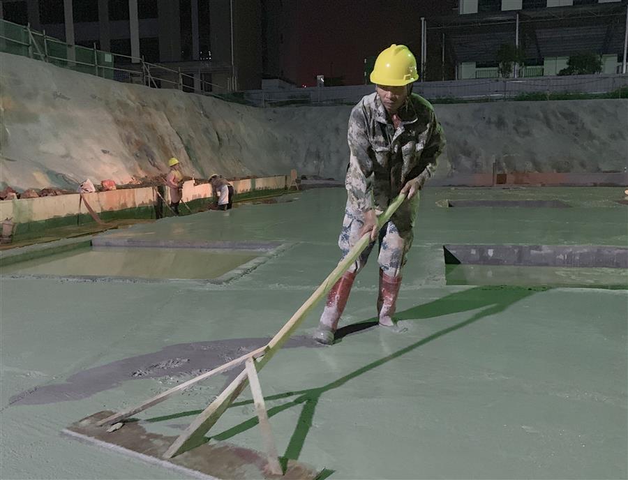 河池羅城供電局本部技術(shù)業(yè)務(wù)用房項(xiàng)目,工人加班進(jìn)行基礎(chǔ)抗水板墊層澆筑。