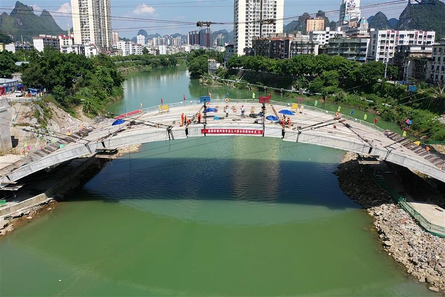 8月3日,隨著最后一節(jié)(第98節(jié))砼拱箱精準(zhǔn)吊裝至預(yù)定位置,標(biāo)志著冶建公司桂金分公司承建的河池市龍江六橋(輝樂橋)順利實(shí)現(xiàn)主拱圈全面合龍。公司黨委副書記、紀(jì)委書記、工會(huì)主席賴海標(biāo)到現(xiàn)場指導(dǎo)。