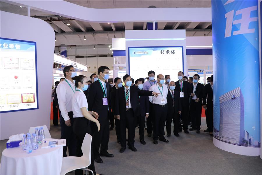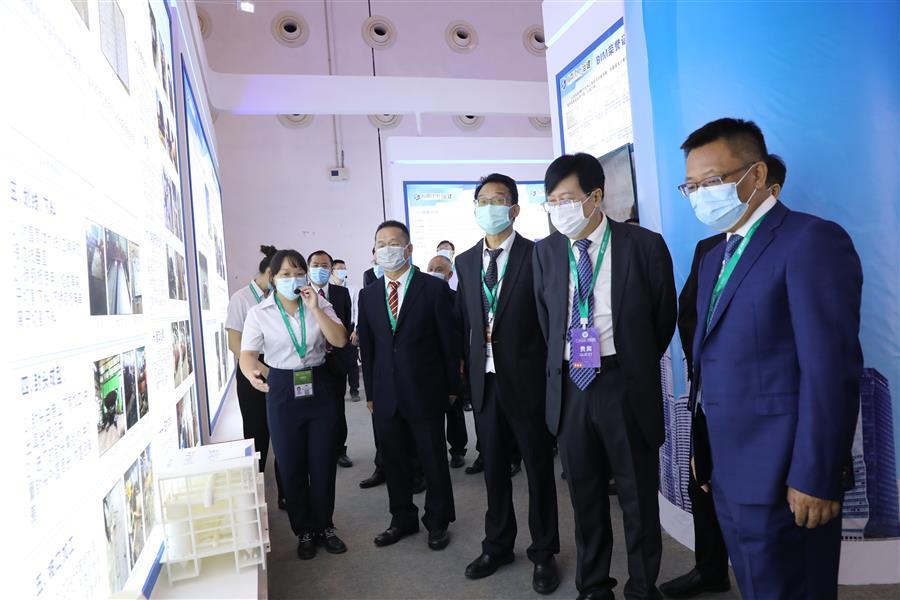自治區(qū)住房和城鄉(xiāng)建設(shè)廳副廳長(zhǎng)葉云(左二)、潘國(guó)雄(左三)一行到冶建公司展區(qū)參觀(guān)