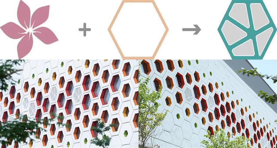 項目整體采用去工業(yè)化設計,將紫荊花與蜂巢的意象同時融入建筑立面,形成“蜂棲紫荊”的寓意;其中紫荊花代表柳州,而蜂巢之中花粉釀蜜的過程,又與垃圾焚燒發(fā)電的工藝流程形成隱喻。
